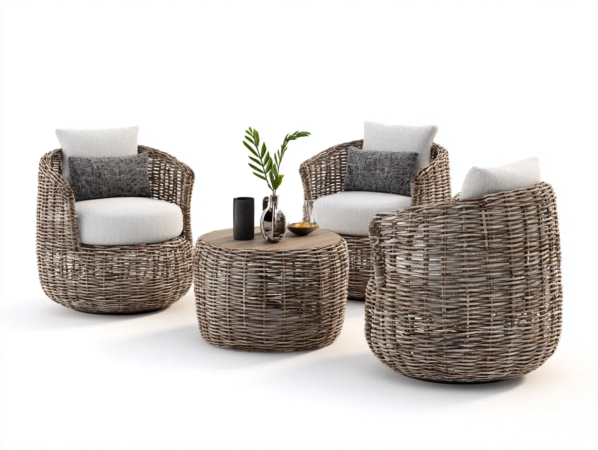 Die Loungesessel bieten eine angenehme Sitzhöhe und eine rundum geschlossene Form. Der runde Tisch stellt eine praktische Ablage für Getränke oder Alltagsgegenstände bereit. Das kompakte Design ermöglicht eine flexible Platzierung auch in kleineren Außenbereichen.