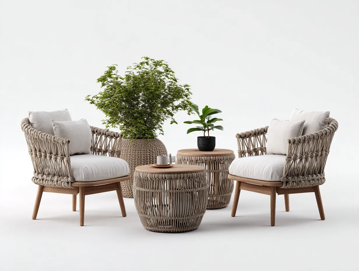 Die Loungesessel bieten eine angenehme Sitzhöhe und eine umschließende Form für entspanntes Sitzen. Die runden Beistelltische dienen als praktische Ablageflächen für Getränke oder Alltagsgegenstände. Das kompakte Design ermöglicht eine flexible Nutzung auch in kleineren Außenbereichen.