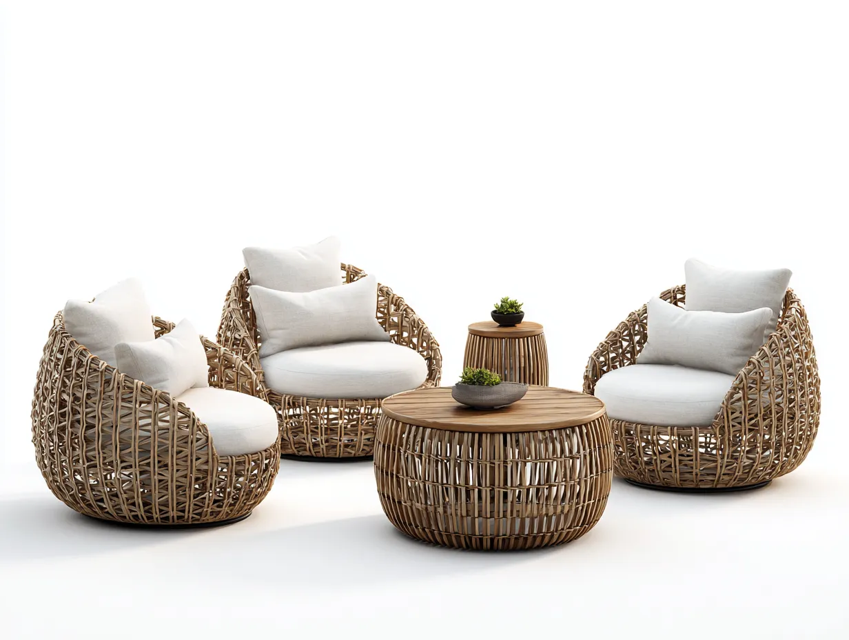 Dieses Garten Lounge Set ist für großzügige Sitzbereiche im Garten, auf der Terrasse oder auf dem Balkon konzipiert. Die runden Formen und das offene Flechtbild schaffen eine natürliche und einladende Atmosphäre. Die Kombination aus Sitzgelegenheiten, Couchtisch und Beistelltisch eignet sich für entspannte Aufenthalte im Außenbereich.