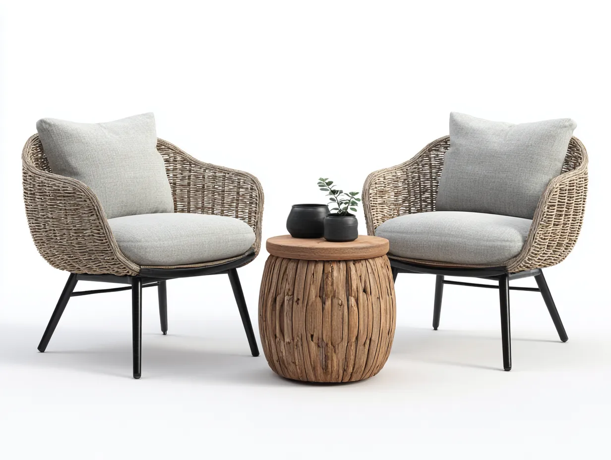 Die Loungesessel bieten eine angenehme Sitzhöhe und eine ergonomische Rückenform für entspanntes Sitzen. Der Beistelltisch dient als praktische Ablagefläche für Getränke oder persönliche Gegenstände. Das kompakte Set eignet sich auch für kleinere Außenflächen.