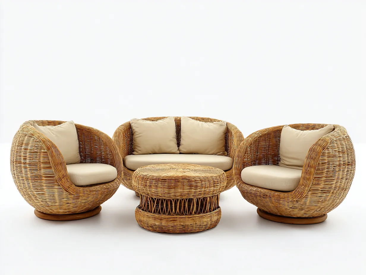 Die Sitzmöbel bestehen aus handgeflochtenem Rattan in Naturbraun. Die Sitzflächen sind mit Textil in Beige ausgestattet. Der Tisch ist aus Rattan mit stabiler Holzbasis gefertigt. Alle Materialien sind sorgfältig verarbeitet und auf den Einsatz im Außenbereich abgestimmt.