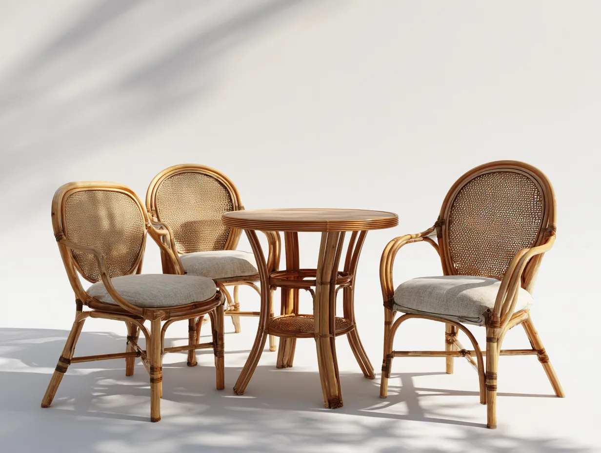 Die Stühle bestehen aus stabilem Rattan in Naturbraun mit Sitzflächen aus Textil in Beige. Der Tisch ist aus Rattan und Holz gefertigt und farblich abgestimmt. Alle Oberflächen sind sauber verarbeitet und für den Außenbereich vorgesehen.