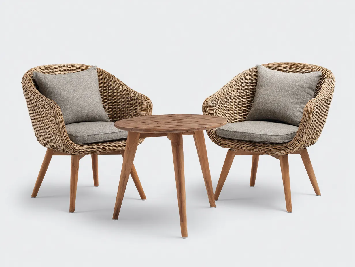 Die Sessel bieten eine angenehme Sitzhöhe und eine leicht geschwungene Rückenform. Der runde Tisch dient als zentrale Ablagefläche für Getränke oder kleine Gegenstände. Die Konstruktion sorgt für Stabilität und Alltagstauglichkeit.
