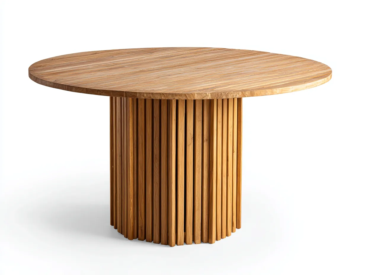 Gefertigt aus massivem Holz in naturfarbener Ausführung. Die Tischplatte besteht aus sauber gearbeiteten Holzleisten mit gleichmäßiger Oberfläche. Die umlaufende Säulenbasis aus vertikalen Holzstreben gewährleistet Stabilität und eine harmonische Gesamtoptik.